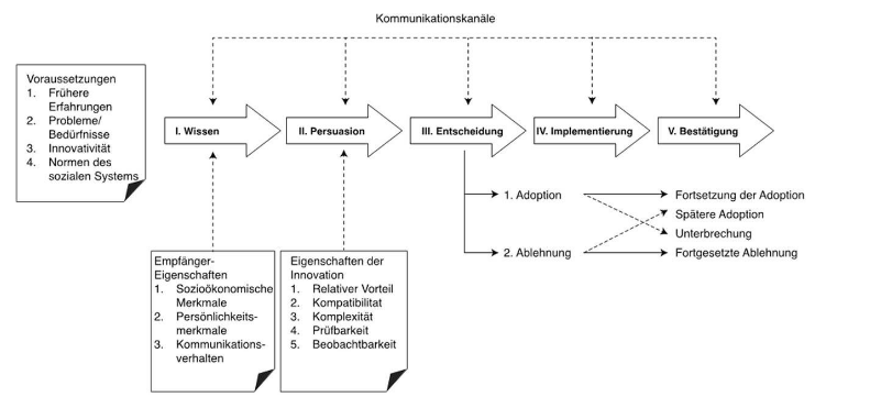 Veränderungsprozesse in Organisationen (und übrigens auch in Gesellschaften) lassen sich als Diffusionsprozesse verstehen. Diffusion meint hier nicht nur die Verbreitung neuer Ideen oder Technologien, sondern vor allem einen Kommunikationsprozess: Menschen tauschen Informationen aus, bewerten sie und entscheiden, ob sie eine Innovation annehmen oder ablehnen. Eine Information wird somit über verschiedene Menschen und in Phasen diffundiert. Ein hilfreiches Orientierungsmodell wie solche Prozesse ablaufen, bietet der amerikanische Soziologe Everett Rogers (2003) mit seinem Innovations-Diffusionsmodell. Das Modell beschreibt fünf mögliche Phasen, die Menschen bei der Annahme einer Innovation durchlaufen:
