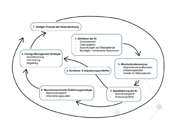 In der Abbildung wird ein exemplarischer Prozess der menschzentrierten Einführung von KI-Systemen konzeptionell dargestelltDieser Prozess wird immer wiederholt, da stets Anpassungen im Unternehmen stattfinden.