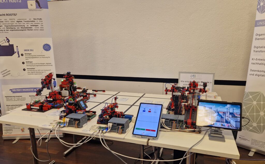 Parallel präsentierten wir auf dem Marktplatz zwei unserer Demonstratoren: die agile Fabrik der Zukunft ermöglichte den Besuchenden einen unmittelbaren Einblick in Industrie 5.0 und bot Anlass zu zahlreichen Gesprächen über Menschzentrierung, Nachhaltigkeit und die Zukunft der Zusammenarbeit von Mensch und Maschine. Daneben der Demonstrator DeNKI, welcher die Besuchenden szenariobasiert die Auswirkungen von KI-Technologien auf Kernmetriken eines Unternehmens oder einer Non-Profit Organisation analysieren und optimieren lässt.